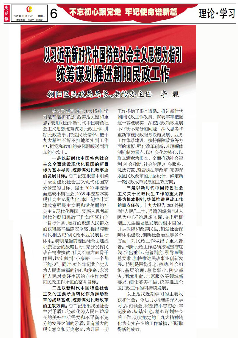 以习近平新时代中国特色社会主义思想为指引统筹谋划推进朝阳民政工作